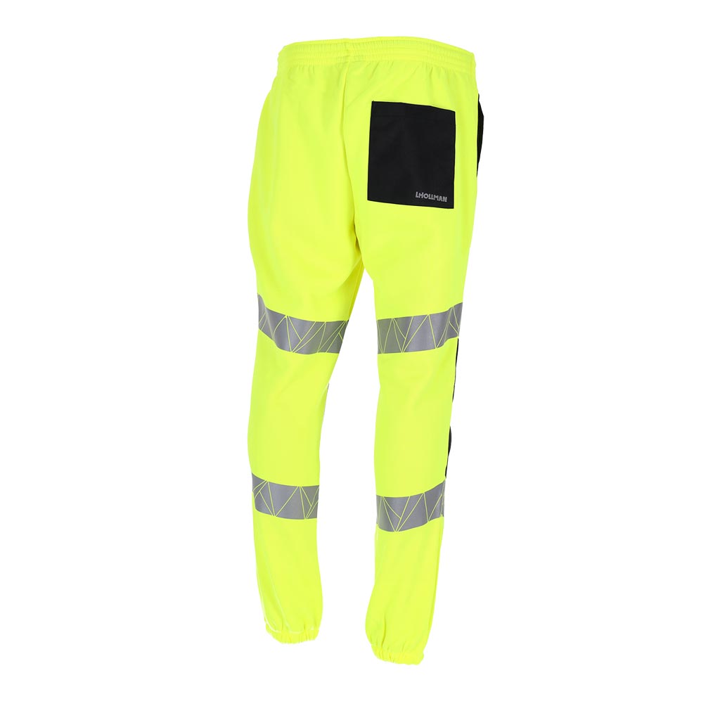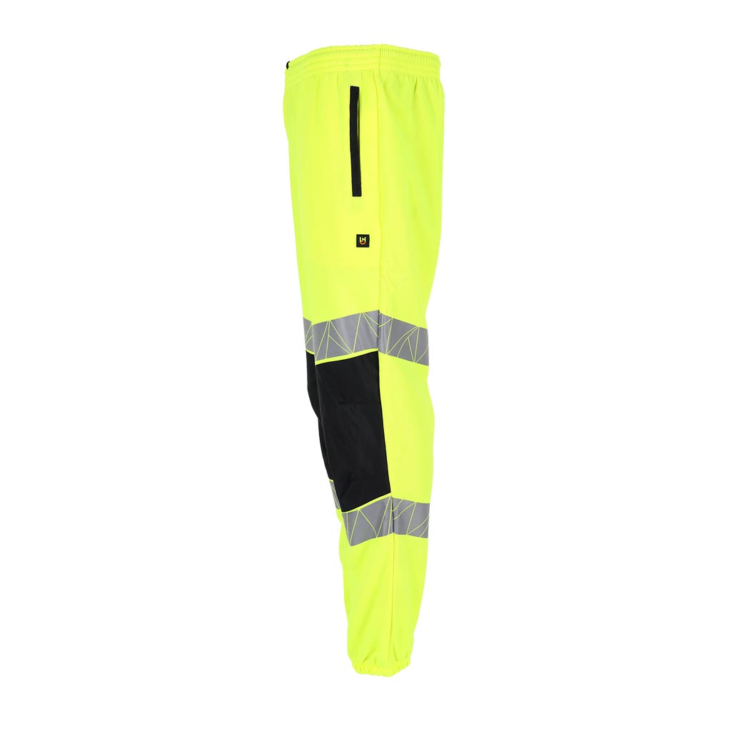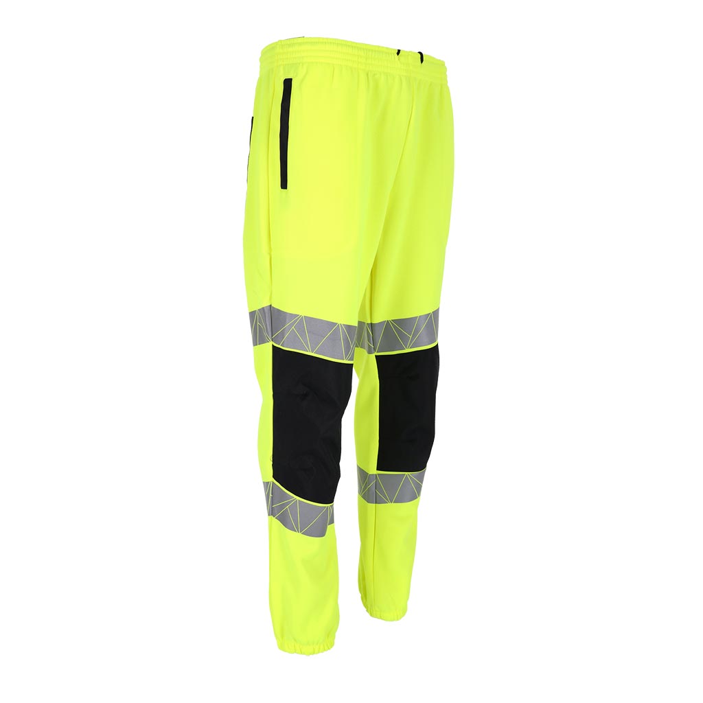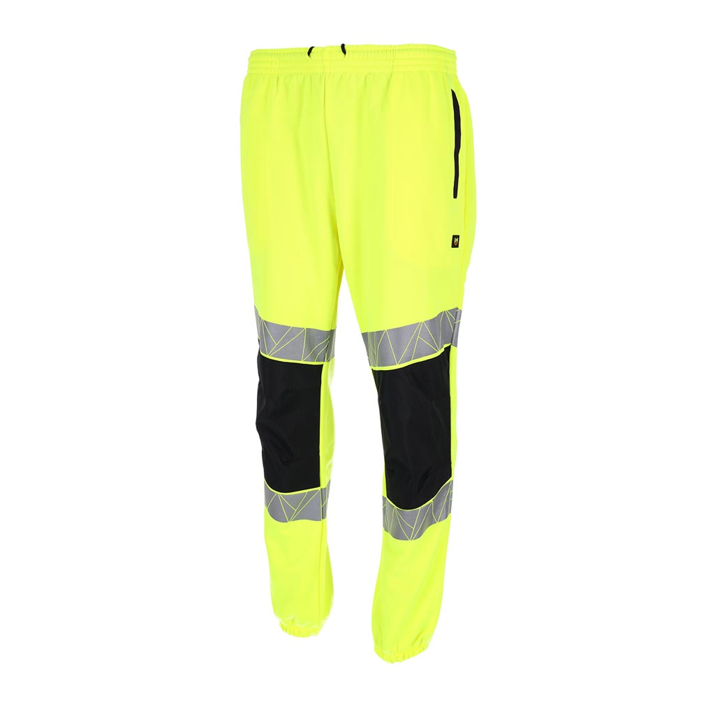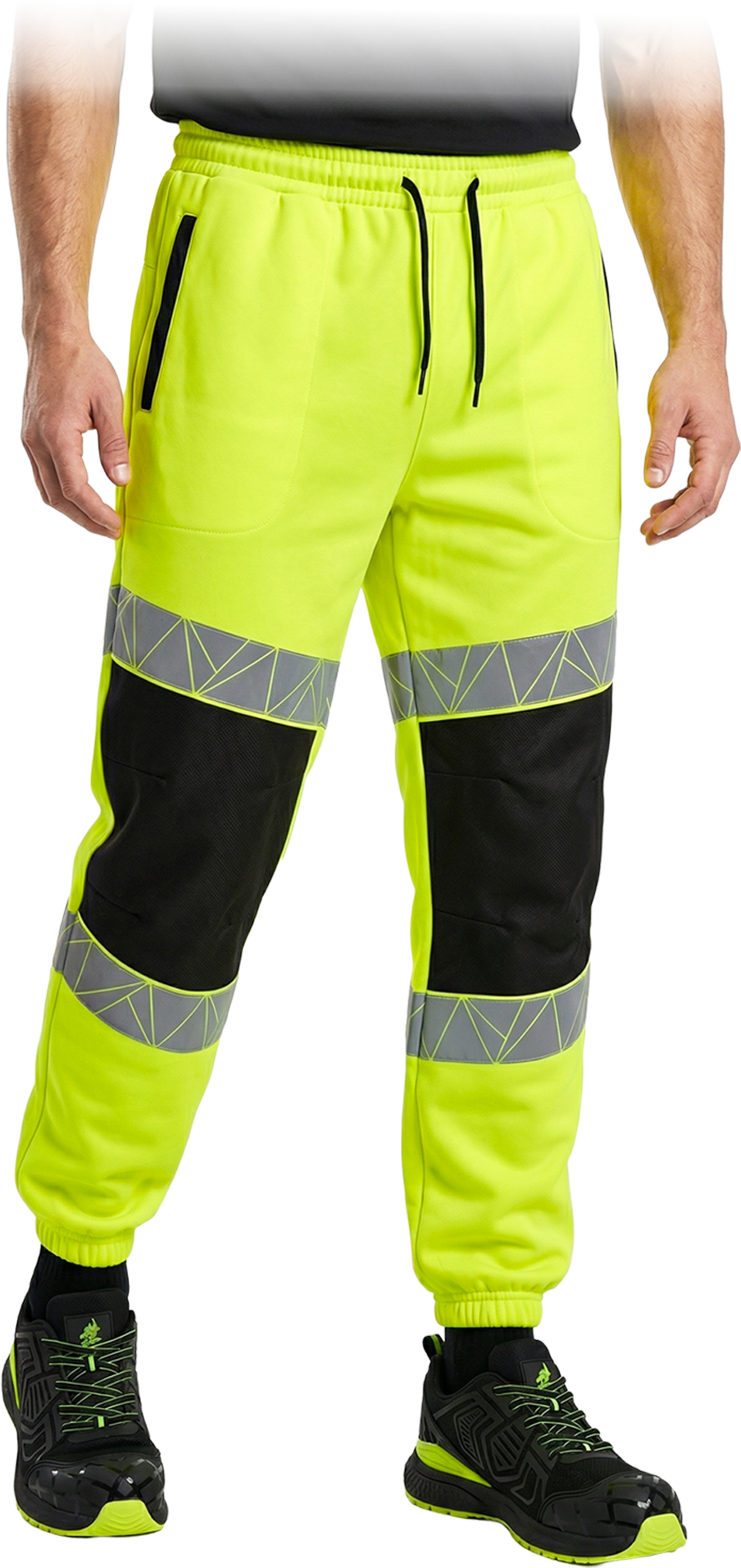 Spodnie ochronne, dresowe, męskie, ściągane na troczki. Dwie kieszenie boczne i jedna tylna, wyprofilowane kolana, gumka w pasie umożliwiająca lepsze dopasowanie, nogawki zakończone ściągaczem. Wykonane z materiału, główny: dzianina z wykończeniem polarowym od wewnątrz 100% poliester o gramaturze 260 g/m. Wstawki: tkanina 100% poliester Oxford 300D o gramaturze 150 g/m². Dzianina we fluorescencyjnym kolorze i segmentowe pasy odblaskowe zwiększające widoczność.